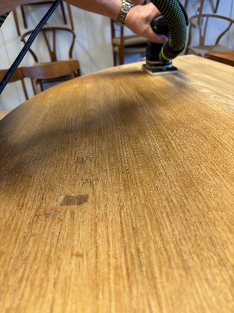 Profesjonell sliping av spisebord skjer i flere trinn for å sikre et jevnt og vakkert resultat: