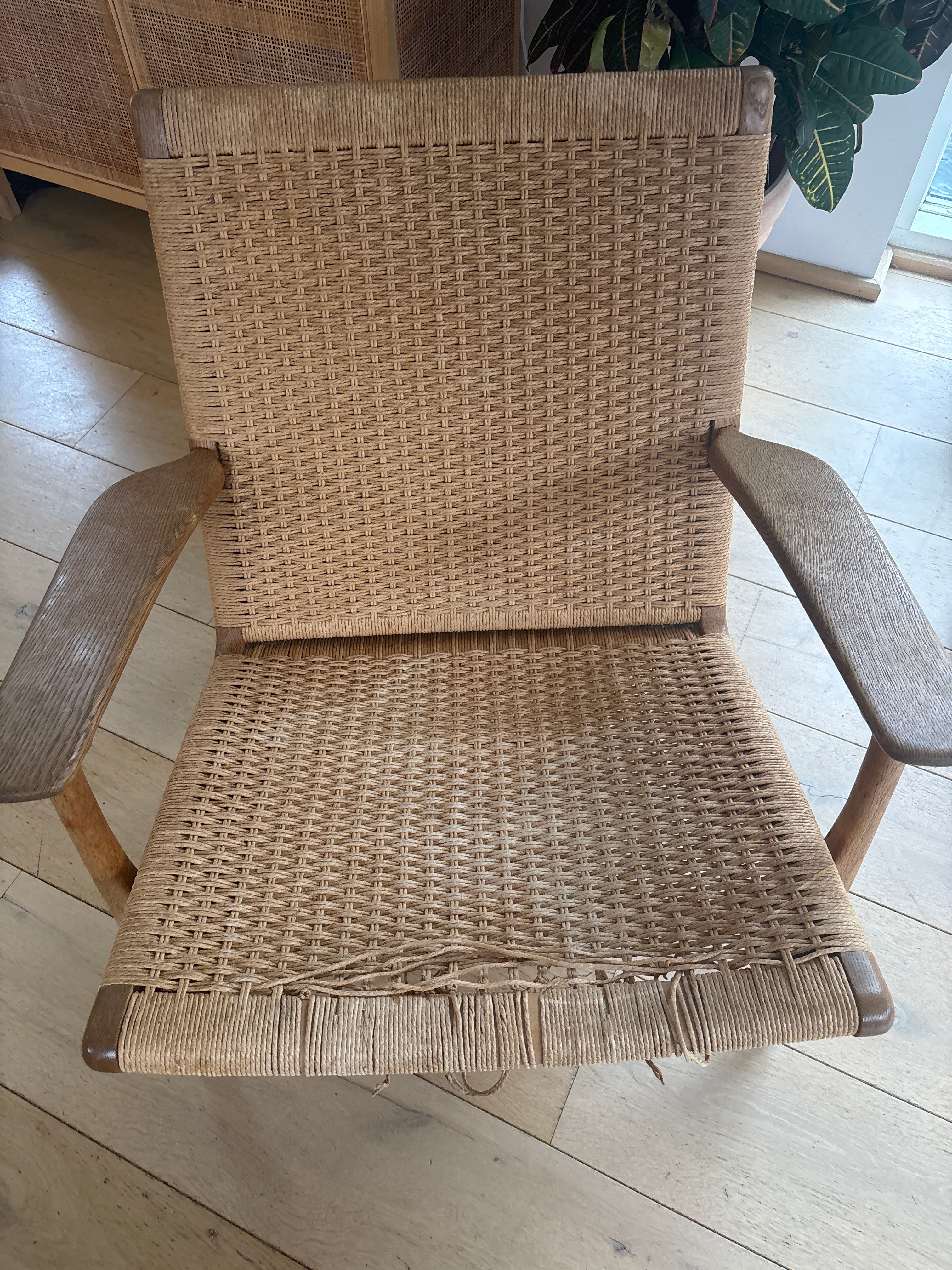 - CH25-lenestolen – En elegant Wegner-lenestol, håndvevd i papirgarn med et unikt flettemønster.